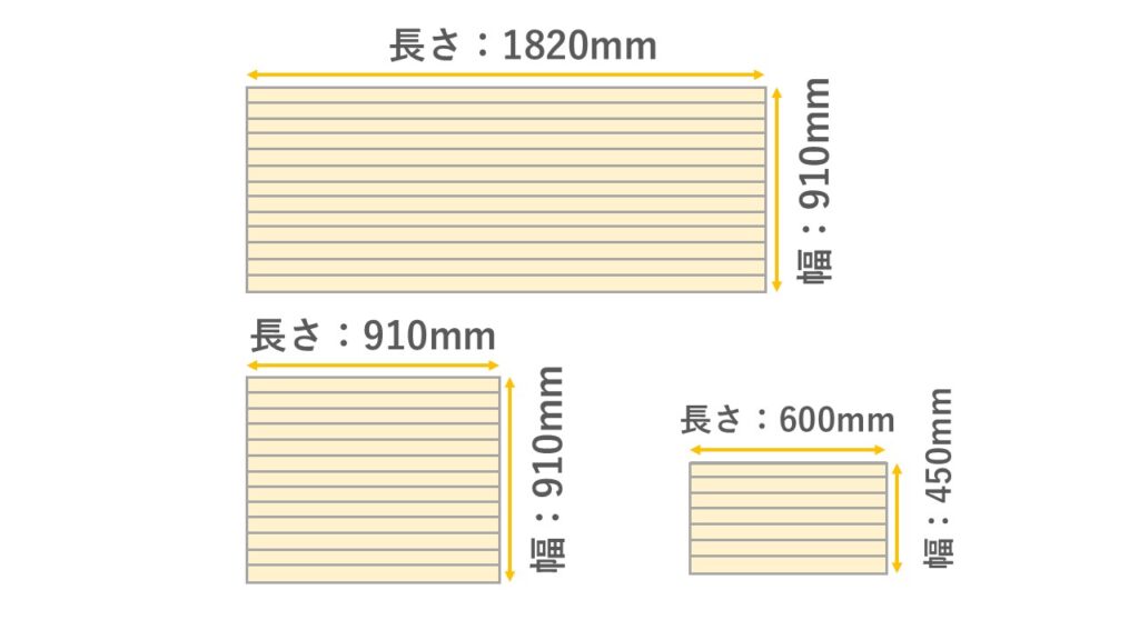 また、ホームセンターではこの半分のサイズの長さ910mm×幅910mmや、一回り小さい長さ600mm×幅450mmというサイズも売られているときがあります。